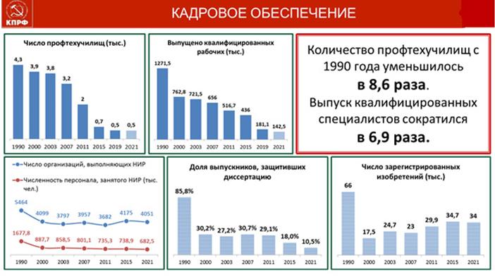 В результате, за тридцать лет в 8,6 раза в стране было сокращено количество профтехучилищ, в 6,9 раза - подготовка квалифицированных специалистов. В НИИР резко уменьшилось число учёных, усугубляется тенденция старения научных кадров. Хотя именно отсюда, по прежнему, берутся и пускаются сегодня в дело остатки разработок советского периода. В том числе, то, что сегодня дальше всех летает и точнее, всех стреляет. А все эти западные структуры(ВТО, Всемирный банк и пр.) за импортозамещение сегодня предъявляют России иск в сумме 290 миллиардов евро. Всё время деятели от либералов внушали обществу, что Россия расплачивается за долги Советского Союза. Хотя, на самом деле, наоборот, Советскому Союзу международные организации Запада должны были 140 миллиардов долларов. Бандитское чубайсовское отродье негласно списало эти 140 миллиардов. Вспомним: Парижский клуб, поездка Чубайса, и одним махом списывались 140 миллиардов. Всемирный банк в 2014 году пообещал России кредит на 14 миллиардов долларов, но решение не состоялось. На основе всех разрушительных фактов, наша фракция подготовила законопроекты о выходе страны из этих организаций, которые годами пили из России кровь и подрывали ее развитие и самодостаточность.