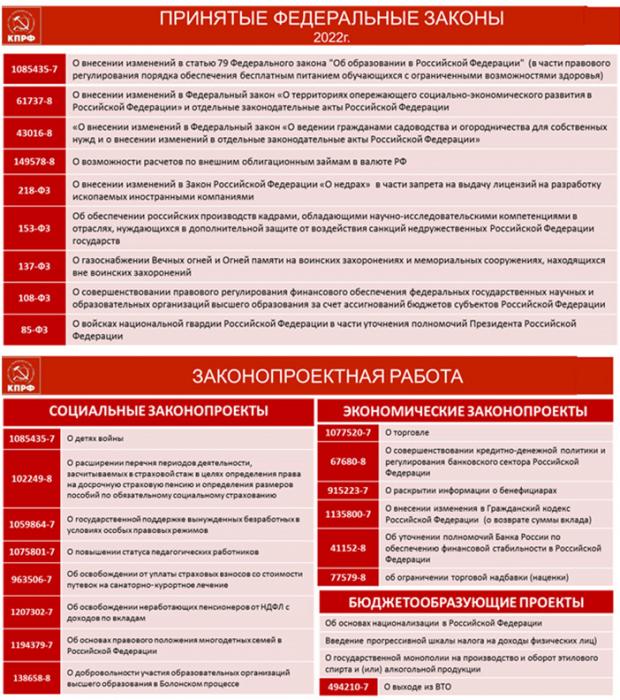 В законодательном портфеле КПРФ на сегодня 152 федеральных Закона по важнейшим направлениям, обеспечивающим успешную реализацию нашей Программы. Среди которых социально значимые законопроекты "Образование для всех", о бесплатном горячем питании школьников, о льготах "детям войны". Мы подготовили и включили в состав важнейших государственных проектов с бюджетным финансированием несколько важных целевых Программ, реализация которых решит вопросы ипортозамещения, укрепит продовольственную безопасность страны, даст жизнь глубинным территориям, возродит село, новые рабочие места, разовьет мощь современного аграрно-промышленного комплекса.