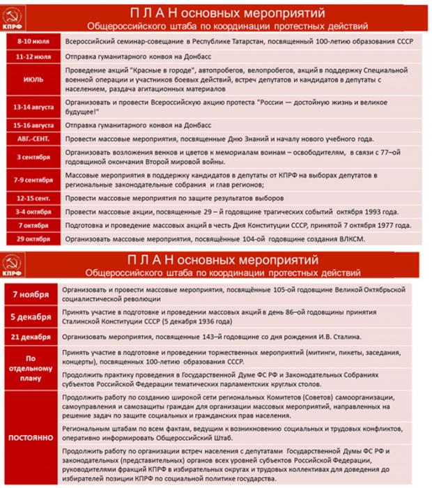 КПРФ активно включилась в работу по подготовке к сентябрьским выборам, которые непосредственно охватывают 19-ть субъектов РФ. Избирательная компания включает в себя выборы глав регионов в 14 субъектах и выборы парламента в шести субъектах, кроме того, пройдут прямые выборы депутатов 12 городских парламентов. Всего будут переизбираться более 30тыс. депутатов регионального и местного уровня(15% всех депутатских мест в стране), и более тысячи глав исполнительной власти всех уровней. Это большая выборная кампания, куда должна быть заряжена вся наша партия и каждый месяц должен быть насыщен нашей борьбой на улице. Мы к нашим политическим листовкам, газетам, плакатам должны добавить политическую сатиру, карикатуру. Кстати, сегодня все видели в демонстрируемом фильме элементы этого вопроса. Договорились при Штабе создать творческую группу и отработать это направление. Надо, не церемонясь, пролетарским сатирическим штыком дать разным чубайсятам, галкиным и прочим хорошего пинка под зад. Эти плакаты должны работать и наши листовки должны работать. Они нам, по большому счёту, очень помогут.