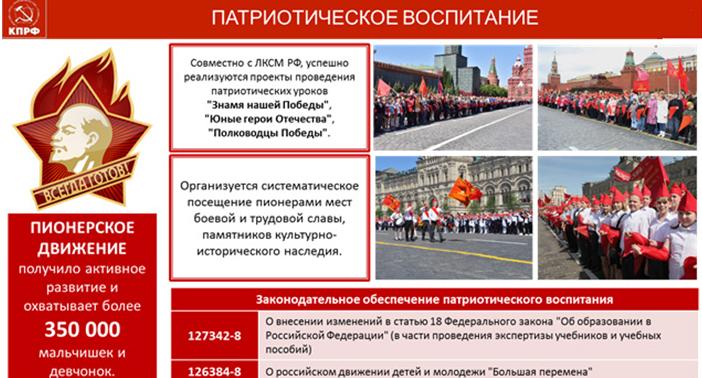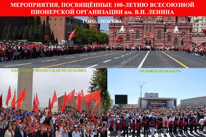 По инициативе КПРФ 19-22мая, в День Пионерии, по всей стане прошли торжественные мероприятия в честь 100-летия создания Всесоюзной пионерской организации имени В.И.Ленина. К юбилею Пионерии выпущена медаль. А 22 мая на Красной площади столицы партия в торжественной обстановке провела Всероссийский Сбор пионерских отрядов.