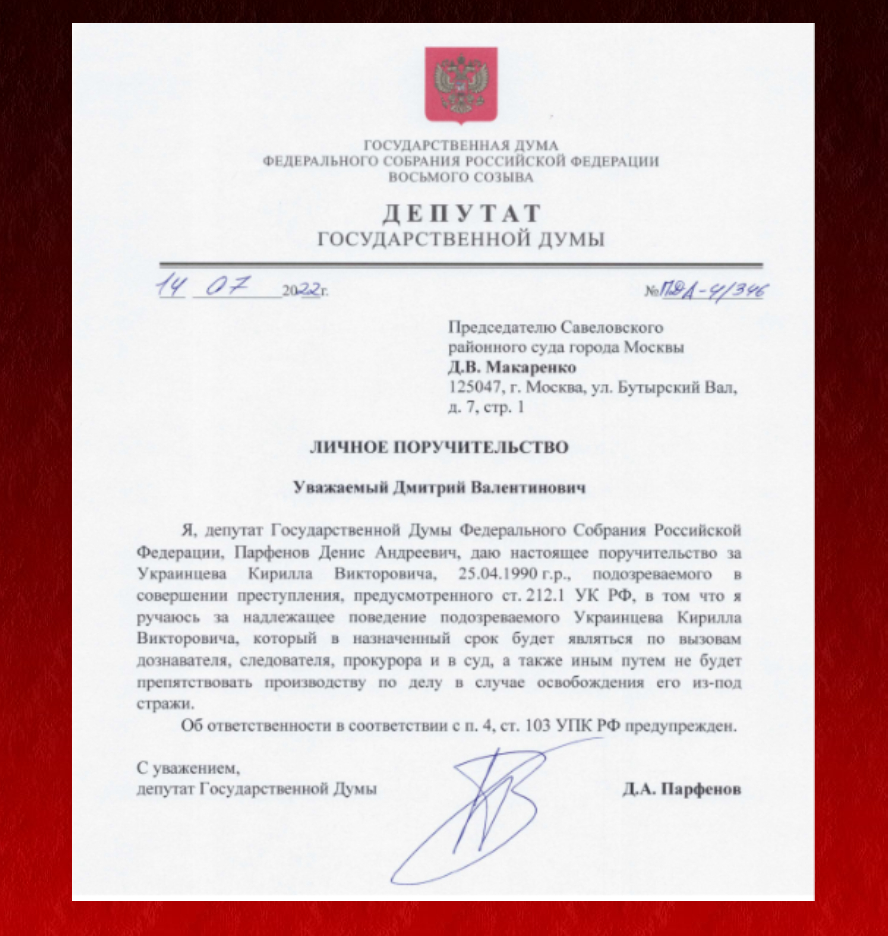 Поручительство нужно, чтобы изменить меру пресечения и выпустить Кирилла из под незаконного заключения под обязательство явки на следственные мероприятия.