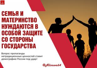 Отрицание семьи как общественной ценности, пропаганда так называемого образа жизни «чайлдфри» (без детей) и популяризация нетрадиционных сексуальных отношений имеют не меньшую степень опасности для развития российского общества, чем законодательно запрещенная пропаганда суицида, наркотиков и экстремизма.