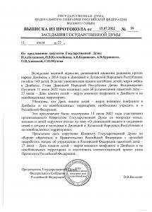 Предлагаем дать поручение Комитету Государственной Думы по обороне обратиться в Правительство Российской Федерации с просьбой проработать вопрос об учреждении в Российской Федерации памятной даты - 27 июля - День памяти детей-жертв военного конфликта в Донбассе и на освобожденных территориях и подготовить соответствующий проект указа Президента Российской Федерации.