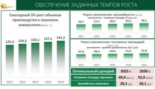 Получается, к примеру, по зерновым, к 2025 году нам надо выйти на стабильные урожаи в 141 млн. тонн. Исходя из этой цифры, становятся ясны задачи на всех других направлениях, и по вовлечению в сельскохозяйственный оборот земель, и по увеличению урожайности.