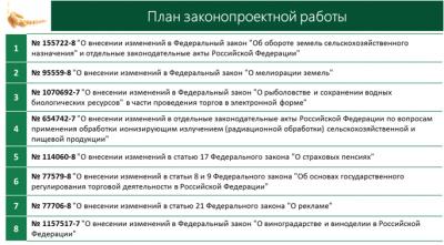 Ведется непростая работа на направлениях законодательного обеспечения развития мелиорации, эффективного использования земель сельскохозяйственного назначения, и т.д.
