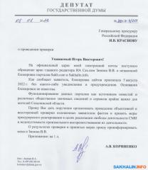 Депутат Госдумы от Сахалинской области Алексей Корниенко отправил ряд обращений в разные федеральные инстанции по поводу блокировки Sakh.com. Письма отправлены генеральному прокурору РФ Игорю Краснову, председателю Союза журналистов России Владимиру Соловьеву, секретарю Общественной палаты РФ Лидии Михеевой, руководителю Федеральной службы по надзору в сфере связи, информационных технологий и массовых коммуникаций Андрею Липову, министру цифрового развития, связи и массовых коммуникаций РФ Максуту Шадаеву.