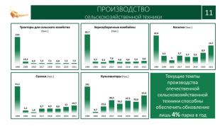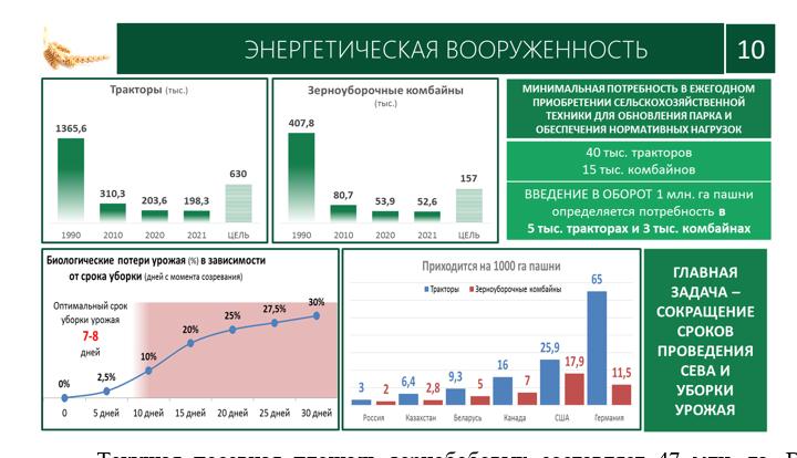 Особое внимание - приобретению сельскохозяйственной техники, темпы которого, в том числе через Росагролизинг, очень низкие. Они обеспечивают лишь 4% обновления парка, но ни как не расширенное воспроизводство. А ведь нам надо понемногу наращивать энерговооруженность. При этом каждый введенный в оборот миллион гектаров требует дополнительно 5 тысяч тракторов и 3 тысячи комбайнов. Мы должны это хорошо понимать, потому что от этого, в том числе, зависит эффективность реализации Государственной программы Второй целины.