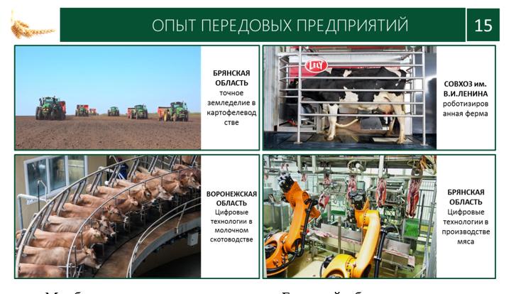 Мы были с выездным заседанием в Брянской области и увидели, как эффективно там реализуются проекты точного земледелия в картофелеводстве, а также внедрения цифровых технологий в производство мяса. Проведя мероприятия на базе Совхоза им. В.И.Ленина мы ознакомились с роботизированной фермой. В Воронежской области мы убедились в эффективности цифровизации молочного скотоводства. Все это мы видели своими глазами.