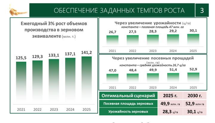 Это значит доведение валового сбора зернобобовых до 141,2 млн. тонн к 2025 году, как за счет повышения урожайности, так и за счет эффективного использования земельного фонда.