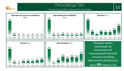 За 30 лет мы стали производить в 28 раз меньше тракторов, в 10 раз меньше комбайнов, и так далее по всем видам сельскохозяйственной техники и навесного оборудования. Да и то, что производим, по сути, не наше. Хороший комбайн Acros, прекрасный ростовский завод, но мотор не наш, гидравлика не наша.