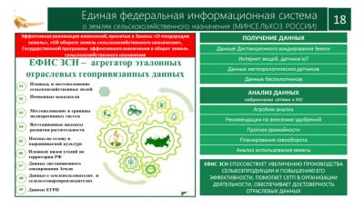 Благодаря этой работе в управлении земельными ресурсами выстраивается новая эффективная модель, соединяющая воедино массивы информации о границах земельных участков, показателях и динамике почвенного плодородия, севооборотах, проводимых мелиоративных мероприятиях, и т.д., с последующим анализом этих данных и моделированием, что существенно повышает эффективность реализации государственной аграрной политики, сохранения земель сельскохозяйственного назначения.