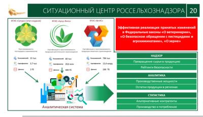 В Россельхознадзоре создан ситуационный центр, объединивший массивы данных из всех цифровых информационных систем Федеральной службы, и выводящий на новый уровень эффективность надзора и отраслевой аналитики в области ветеринарии, продукции растительного происхождения, а также пестицидов и агрохимикатов.