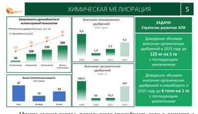 Многие задают вопрос, почему такая урожайность даже в регионах с благоприятными агроклиматическими условиями, при том, что у нас есть высокопродуктивные сорта. Вот – прямая зависимость урожайности от количества вносимых в почву минеральных удобрений. Президент Российской Федерации поэтому в своих поручениях и говорит о необходимости сохранения и восстановления плодородия почв.