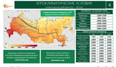 За 10 лет среднегодовая температура на территории Российской Федерации увеличилась на 0,51 градус. Рядом же мы видим необходимые различным культурам суммы активных температур. Исходя из этого, расширяются возможности получения полутора-двух урожаев на многих территориях, конечно при использовании правильных севооборотов.