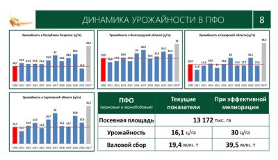 При том, что посевная площадь более 13 млн. га, в прошлом году валовой сбор по округу был меньше 20 млн. тонн. Урожайность как была в Самарской области в 1990 году 18,9 ц/га, так в 2021 году и осталась на том же уровне. Аналогичная ситуация в Саратовской, Волгоградской областях и других регионах.
