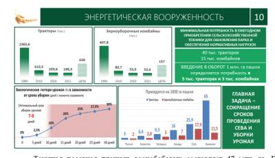 Четко обозначена задача – 3% ежегодный рост объемов производства продукции АПК. Исходя из этого даны поручения в части минеральных удобрений, вовлечения сельскохозяйственный оборот земель, широкого внедрения средств механизации и информационных технологий.