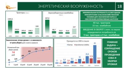 Нам надо стремиться к тому, чтобы парк сельскохозяйственной техники у нас состоял из 630 тыс. тракторов и 157 тыс. комбайнов. Наши соседи по 3-5 комбайна на 1000 га имеют!