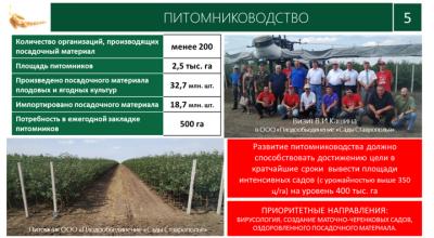 Фотография на слайде – это мы находимся в Садах Ставрополья – уникальном питомниководческом хозяйстве по производству посадочного материала, где отработаны все технологии, в том числе агротехнические, производятся лучшие сорта. Если в каждой климатической зоне у нас было бы такое хозяйство, то это направление в импортозамещении у нас было бы закрыто.