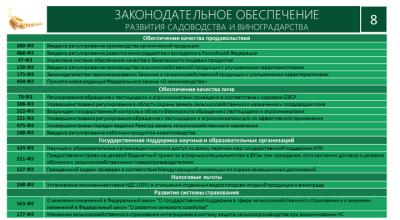 За последний год мы приняли 17 федеральных законов, существенно укрепляющих правовое регулирование развитие агропромышленного комплекса Российской Федерации, в том числе таких важнейших отраслей, как плодоводство, овощеводство и картофелеводство.