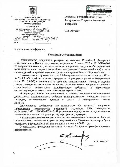 Органы исполнительной власти в своих ответах регулярно ссылаются на эти указы правительства, и, видимо, с их точки зрения, это уже стало универсальной отпиской в ответ на заявления о беспределе крупного бизнеса. В этот раз мы получили подобный ответ от Минприроды по поводу очередной атаки застройщиков на Лосиный остров, о которой некоторое время назад писала Народная приемная КПРФ в ВАО. Выглядит эта чиновничья отписка вот таким образом: