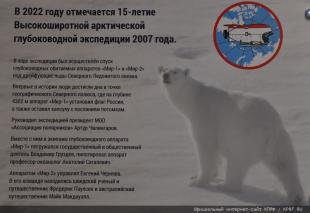 В 2007 году впервые в истории люди достигли дна Северного Ледовитого океана в географической точке Северного полюса, где на глубине 4302 м был установлен флаг России. С той поры прошло 15 лет. В честь знаменательной даты 20 сентября 2022 года в Государственной Думе открылась выставка с уникальными фотографиями. В церемонии открытия выставки приняли участие Председатель ЦК КПРФ, Руководитель фракции КПРФ в Госдуме Г.А. Зюганов и председатель комитета Госдумы по развитию Дальнего Востока и Арктики Н.М. Харитонов.