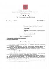 На основании вышеизложенного, в связи с вопросами, встречающимися в практике депутатской деятельности, руководствуясь требованиями статей 14 и 17 Федерального закона «О статусе сенатора Российской Федерации и статусе депутата Государственной Думы Федерального Собрания Российской Федерации», прошу Вас провести проверку обозначенной в данном депутатском запросе информации и при её подтверждении принять соответствующие меры, направленные на осуществление демобилизации ошибочно призванных граждан и привлечение виновных лиц к ответственности.