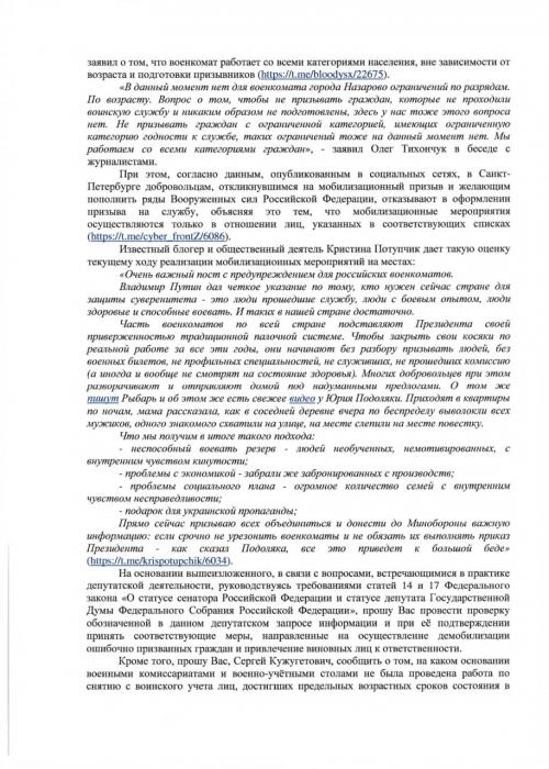 Исходя из многочисленных обращений и публикаций по эксцессам в ходе объявленной мобилизации депутат Государственной Думы Сергей Обухов направил соответствующие запросы министру обороны Шойгу и уполномоченному по правам человека Москальковой.