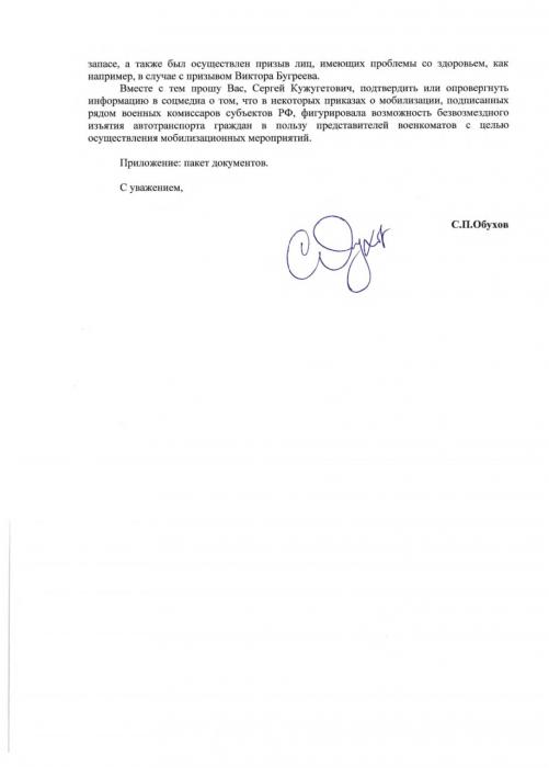 Вместе с тем прошу Вас, Сергей Кужугетович, подтвердить или опровергнуть информацию в соцмедиа о том, что в некоторых приказах о мобилизации, подписанных рядом военных комиссаров субъектов РФ, фигурировала возможность безвозмездного изъятия автотранспорта граждан в пользу представителей военкоматов с целью осуществления мобилизационных мероприятий.