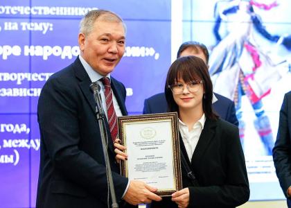 В завершение церемонии открытия выставки Председатель Комитета Госдумы по делам СНГ, евразийской интеграции и связям с соотечественниками представил победительницу конкурса Владелику Кеткову, которой 14 лет. Она приехала из Мариуполя. Ее рисунок "Величие страны" полностью раскрыл значимость тематики проведенного конкурса, показывающего многонациональность России. Леонид Калашников с удовольствием вручил ей благодарность комитета.