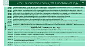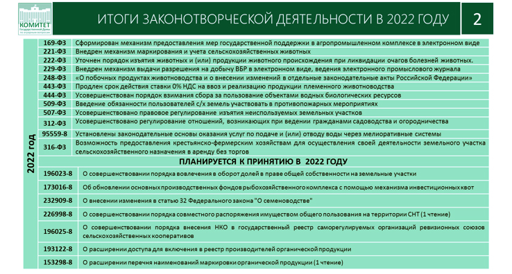 Я должен ее сравнить, и Министр тоже об этом говорил, что в отдельные периоды целого созыва принималось значительно меньше законов. Мы приняли законы и в вопросах дальнейшего активного ведения программы "второй целины", усовершенствования систем восстановления и сохранения плодородия почв и всего, что связано с развитием племенного животноводства, использования побочных продуктов животноводства, а также совершенствования налогового законодательства, и т.д.. При этом целый перечень законодательных инициатив нам еще предстоит принять в текущем году, а также продолжить нашу общую с Министерством работу по совершенствованию системы государственных программ.