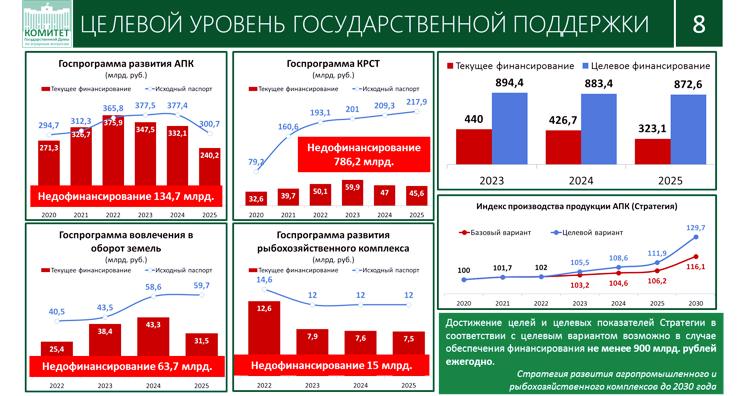 Мы очень благодарны всем руководителям фракций, Вам, Вячеслав Викторович, а также Валентине Ивановне Матвиенко, когда на весеннем заседании Совета законодателей Российской Федерации вы поддержали наше предложение финансировать эти программы по исходному паспорту. Именно поэтому, мы убеждены, появилось движение вперед. Но оно недостаточное, в том числе, с учетом недавно утвержденной новой редакции Стратегии развития агропромышленного и рыбохозяйственного комплексов до 2030 года. В ней четко записано, для того чтобы обеспечить индекс производства продукции АПК к 2030 году в 129 пунктов, требуется финансирование не менее 900 миллиардов ежегодно!