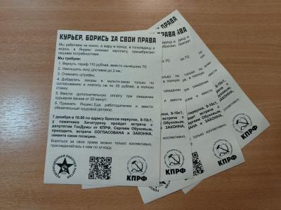 КПРФ включилась в работу по отстаиванию интересов тружеников службы доставки: на минувшей неделе была проведена встреча с депутатом Госдумы Сергеем Обуховым, направлены депутатские запросы. Совместно с лидерами профсоюза "Курьер" и представителями КПРФ был сформирован координационный штаб.