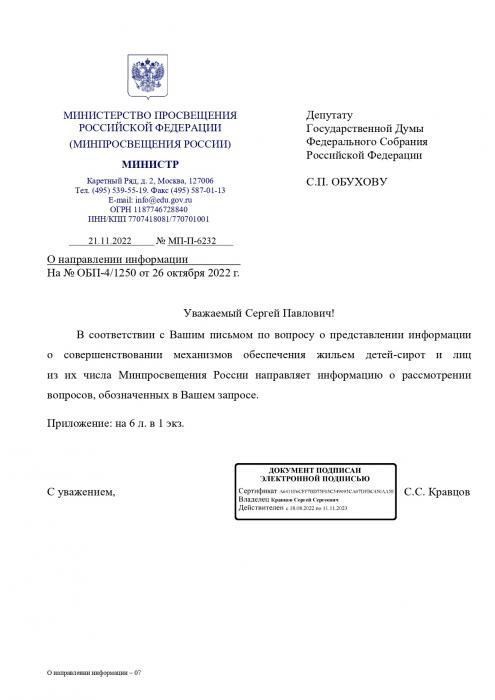 В настоящий момент депутат Сергей Обухов намерен направить депутатский запрос в адрес Правительства Российской Федерации, в котором будет поднят вопрос об организации мониторинга Минпросвещением и Минстроем рыночных цен на жилье с целью оперативной корректировки закупочной стоимости квартир для детей-сирот, а также отражения рыночных цен при определении суммы сертификата, предоставляемого детям-сиротам для покупки квартиры.