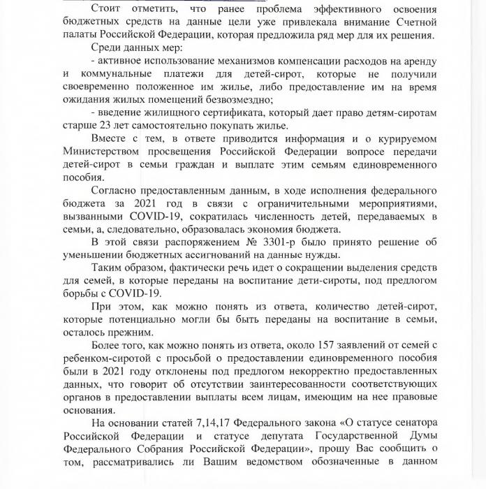 Что же касается отказа от сокращения выплат на единовременные пособия семьям, воспитывающим детей-сирот, то тут Минпросвещения, ответственное за данное направление, заявило о том, что оно не имеет отношения к решению этого вопроса, однако само обращаться никуда не собирается, предложив сделать это депутату самостоятельно! Фактически, такой ответ можно расценить как одобрение отказа от поддержки семей, воспитывающих детей-сирот.