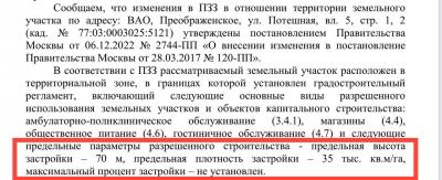 К примеру, чтобы изменить высоту застройки на месте снесенного НИИДАРа, 20 сентября 2022 года выпустили Постановление 2039-ПП, в котором предельная высота увеличена с 50 до 60 метров. Теперь застройщик сможет развернуться здесь на широкую ногу. Соответствующие изменения уже внесены в проектную документацию будущего ЖК. А в декабре аналогичное постановление было принято для ещё одного участка земли в Преображенском по адресу ул. Потешная, вл. 5, стр. 1, 2. Только здесь высота застройки увеличена аж до 70 метров.