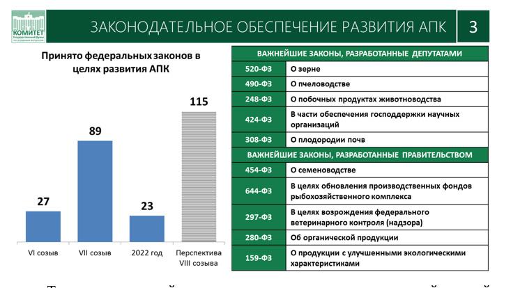 Только за прошлый год мы приняли сопоставимое со всей шестой Государственной Думой количество законопроектов. При этом законопроектов много депутатских, рассмотренных под лозунгом «настало время собирать камни». Мы приняли законы по зерну, о побочных продуктах животноводства, о господдержке научных организаций, о плодородии почв. Это базовые законы, обеспечившие развитие ключевых подотраслей АПК, призванные сберечь ресурсы. Это все инициативы депутатов Государственной Думы. Большая работа была проведена с правительственными законопроектами. К примеру закон об инвестиционных квотах, или о ветеринарии, возродивший федеральный контроль на этом направлении, и ряд других законопроектов.
