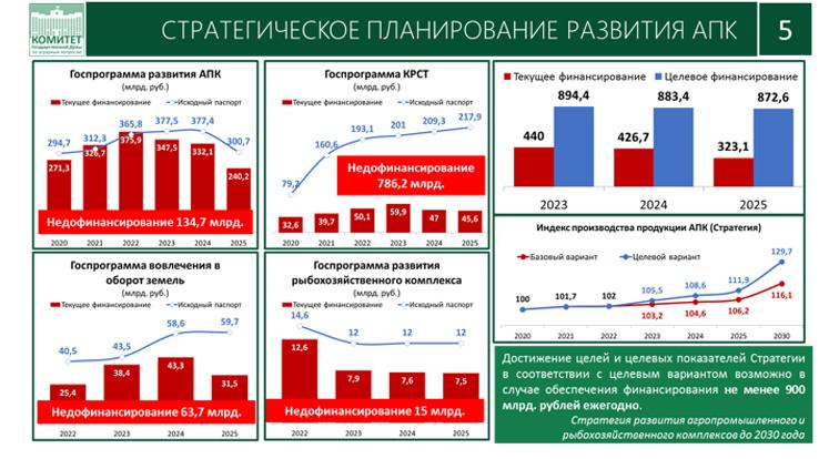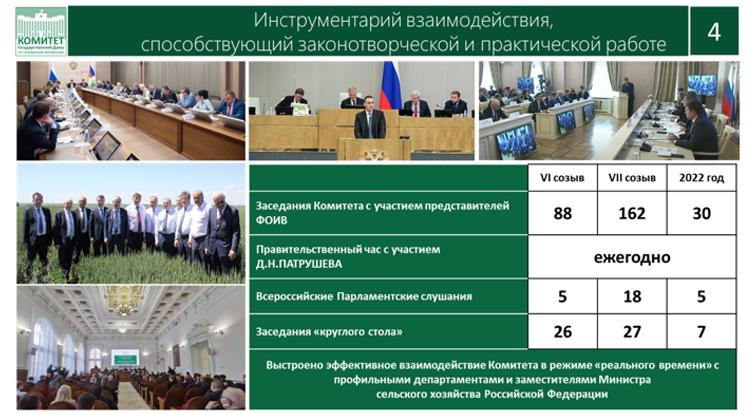 Мы эффективно поработали с Правительством на направлении стратегического планирования. Большинство из наших государственных программ родились в результате проведенных на площадке Государственной Думы слушаний - это Государственная программа эффективного вовлечения в оборот земель сельскохозяйственного назначения и развития мелиоративного комплекса Российской Федерации, а также Государственная программа «Комплексное развитие сельских территорий».
