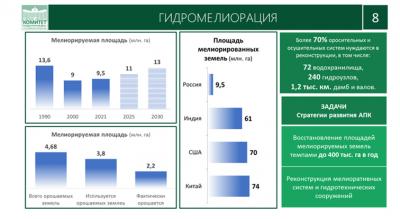 Государству и регионам этим вопросом нужно активно заниматься, тем более с учетом изменений климата. Впереди нас наши недруги имеют 50%-60% мелиорируемых земель.