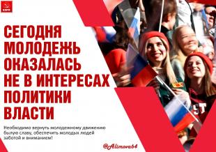 Исключительно реализация социально-экономической программы КПРФ позволит создать развитую систему социальных гарантий для молодёжи, вернуть ей уверенность в завтрашнем дне, развернуть государство в сторону интересов каждого человека. Необходимо вернуть молодежному движению былую славу, обеспечить молодых людей заботой и вниманием!