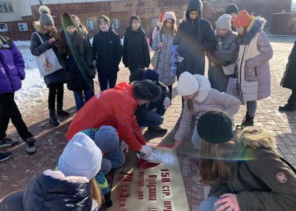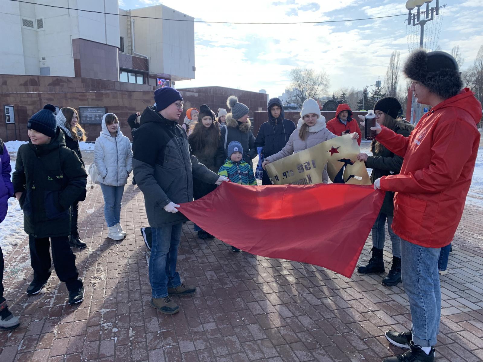 Еще до начала встречи, на площадке у здания музея-диорамы белгородские комсомольцы во главе со своим руководителем Богданом Войлоковым вместе с ребятами изготовили копию Знамени Победы. Работали с интересом, ведь сам процесс был увлекательным. К тому же школьники узнали много нового об истории Знамени Победы.