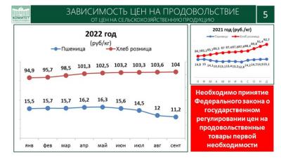 Завершая свои пожелания, хочу, уважаемые товарищи, еще ряд вопросов отметить. Ни одна отрасль не может работать сегодня с точки зрения распределения конечного труда в виде прибыли, в виде заработных плат. И в этом плане сегодня как никогда очевиден тот диспаритет цен, который есть уже в агропромышленном комплексе. Вот у нас сегодня забирают зерно на уровне 2018 года. По цене за килограмм 11-12 рублей. Мука стоит 23-24 рубля. Хлеб выпеченный из килограмма муки получается 2,5 батона, стоит где-то 50-54 рубля, а в торговле 125 рублей стоят эти 2,5 батона. И мы видим труд крестьян, которые целый год трудились, чтобы получить эту пшеницу хорошего качества с хлебопекарными свойствами и наценку торговли, которая многократно превышает стоимость труда крестьян. Это несправедливо.