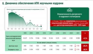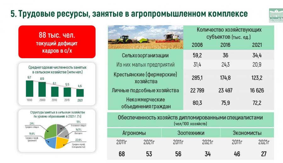 Уважаемые товарищи, трудовые ресурсы. В этом ключе ещё раз хочу обратить внимание, 4,6 миллиона человек работает на селе, сократилось у нас работающих в агропромышленном комплексе – почти в два раза. А каждый на селе работающий, научно обоснованная сегодня тема, она явная, минимум раньше 7, сейчас, наука говорит, 11 рабочих мест дает городу. Вот поэтому мы потеряли много рабочих мест. Мы должны понимать, что трудовые ресурсы сегодня, особенно вооруженные знаниями, и технологии, которые мы сегодня освоили и в растениеводстве, и в животноводстве, – это сплав того, чтобы идти на результаты амбициозные, о которых говорим сегодня. Обратите внимание, что происходит с работающими на 100 коллективов агрономов, зоотехников, и других специалистов. Посмотрите, какое сокращение идет, даже мы взяли с 2000 года, а если с 1990-м, там вообще даже сравнивать не очень удобно.