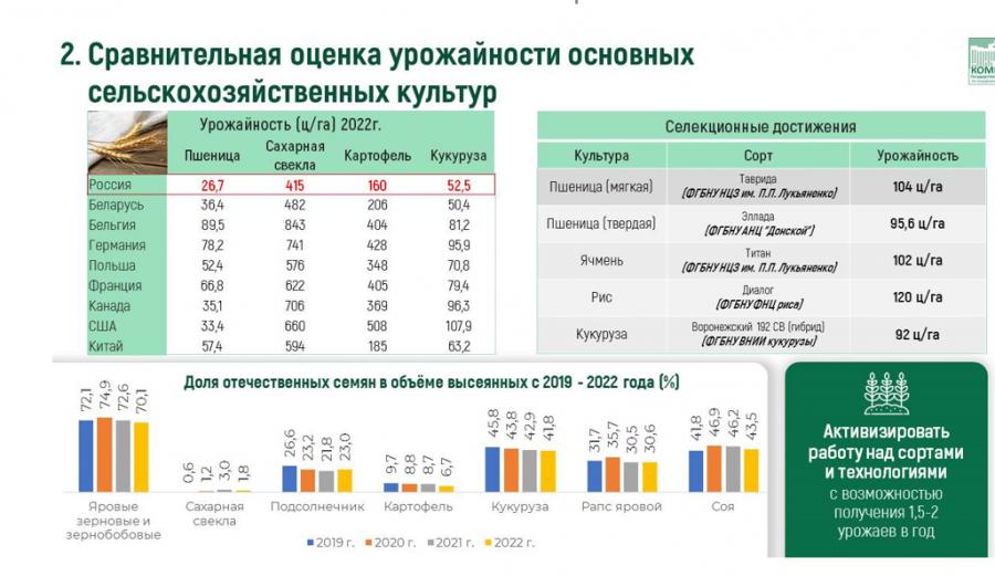 Поэтому задачи комплексные мы должны решать комплексно. А возможность у нас есть. Несмотря на то, что в сравнительной оценке мы имеем урожайность значительно ниже, чем в Европе, и по зерновым в том числе, и по другим культурам, но можно увидеть, что те сорта, которые созданы нашими учёными и по твёрдым, и по мягким пшеницам, они за 100 центнеров, как и по другим культурам: и кукуруза, и рис, и всё, что касается других культур (плодовые, овощи, картофель, технические).