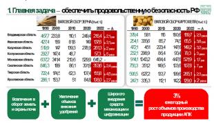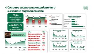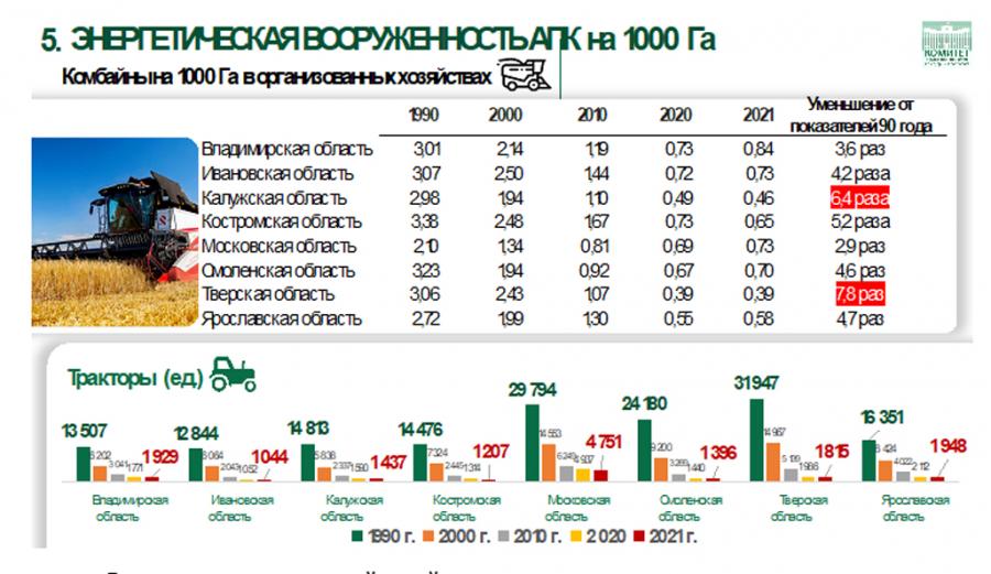 Регион безусловно отличается от Краснодарского края или Орловской области. Тем не менее, уважаемые товарищи, я хотел бы, чтобы мы всё-таки посмотрели на валовой сбор зерна за 90-й год и 22-й год, один из лучших годов, когда вот мы получили в целом по России рекордные показатели, которых не было в СССР. Тверская область в 4,5 раза меньше стала производить зерна. Костромская в 5 раз меньше. Валовый сбор картофеля, посмотрите к примеру в Смоленской области в 7 раз меньше. У нас есть области с другими результатами, к примеру Тюменская и Брянская где совершенно другая динамика. Вместе с тем Ивановская, Московская и другие области допустили резкий спад результатов. Слайд №1 свидетельствует об этом. Я понимаю, что сегодня министры, не несут за это ответственность, многие работают не такой большой период времени и к разрушительным процессам не имели непосредственного отношения, но мы должны всё-таки видеть, что же получали наши товарищи предыдущих поколений в свое время и оценивать свою работу, исходя из этого.