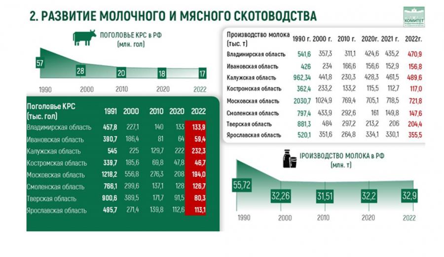 Можно посмотреть слайд по молочному животноводству, давайте обратим внимание на валовое производство, возьмем те же опять области которые вы представляете. Из всего спектра можно выделить по валовке молока Владимирскую область, здесь небольшое отставание, а остальные имеют очень резкое снижение. Тверская область в 4 раза меньше производит молока, в Смоленской области – в 5 раз хуже показатели чем в период Великой Отечественной войны. Мы же понимаем, что такое молочное животноводство. Это основной хребет АПК, это и рабочие места и передел сочных, сухих кормов и зерна в продукцию с высокой добавленной стоимостью.