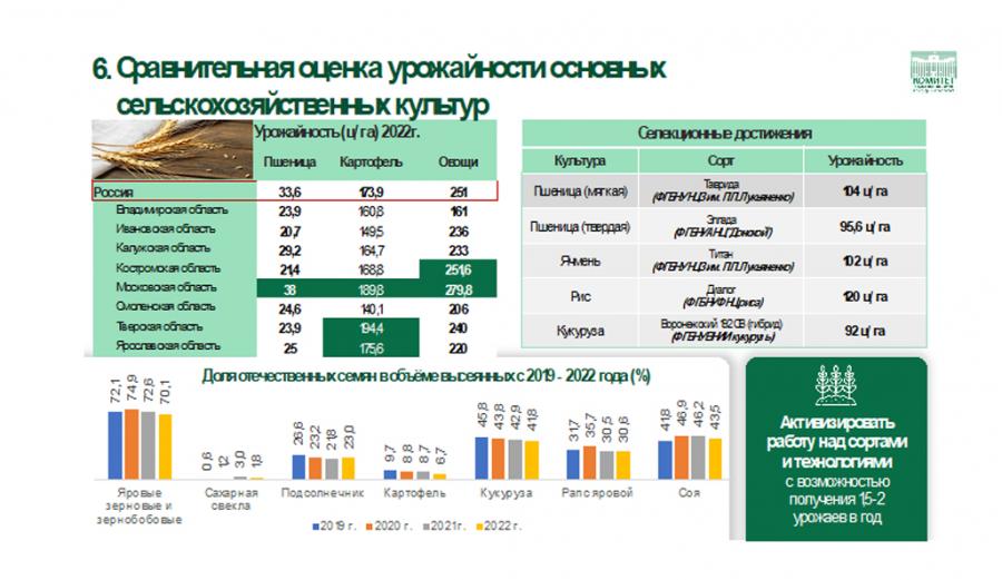 В этом плане у нас первый этап 13,5 миллионов га, исходя из паспорта. 13,5 млн га мы должны ввести в севооборот к 2030 г., а вообще-то нам надо хотя бы 30 млн возвращать в севооборот. 117 млн га было в севообороте в 1991 году, а сейчас 81 млн га, ну вы же знаете по своим областям, где бурьян произростает сплошной, несмотря на то, что в последние 2-3 года уже были приняты нами необходимые программы, согласно которым должен быть рост посевных площадей в ваших территориях. Ведь там такой запас огромный, такой рост должен быть значительный, а не наоборот. Обратите внимание, Ярославская область в 2019 г. – 299 тыс. га, в 2022 году - 244 тыс. га. Учитывая, что программа и для других областей принята, можно и по другим областям дать оценку - посмотрите, и Кострома и Ивановская область, и Тверская область. Слушайте, ну не нигде нет роста и опять и опять снижение. Куда снижаться? Вы эти картинки покажите губернаторам, они все такие мощные и красивые наши друзья. Но также нельзя дальше работать!