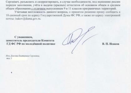 Учитывая данную произошедшую коллизию, Владимир Исаков обратился к министру просвещения Российской Федерации, чтобы профильное министерство разъяснило и скорректировало, в случае необходимости, под нынешние реалии порядок заполнения, учёта и выдачи (красных) аттестатов об основном общем и среднем общем образовании с отличием выпускникам 9 и 11 классов приграничных территорий.