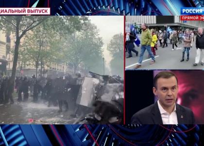 Первый зампред ЦК КПРФ предложил участникам программы и телезрителям обратить внимание на мощные массовые акции, которые прошли в Европе на Первомай. Во Франции в эти дни протесты достигли апофеоза. Очень мощными были первомайские акции в Италии, Германии, Греции. Даже если просто посмотреть на фотографии, видно по плакатам, что распространенным требованием на европейских первомайских акциях стало прекращение поставок оружия киевскому режиму. Протестующие европейцы также вспоминали погибших в Доме профсоюзов в Одессе 2 мая 2014 года.