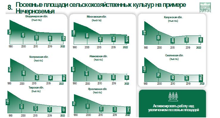 Можно посмотреть следующий сайд, 25% в некоторых регионах у нас всего используют земли к 90-му году, возьмите Смоленская, Тверская, Ивановская область – 25% всего лишь.