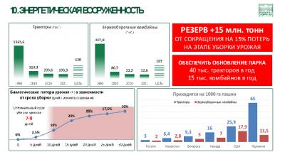 Давайте посмотрим на энергетическую вооруженность, в настоящее момент у нас есть проблема с комбайнами. Коробка передач, гидравлика – все это чужое. Посмотрите какая у нас энергетическая вооруженность. В среднем два комбайна рисуем, но мы же рисуем. Получается, что у фермеров больше и выше вооруженность, чем у всех других. Тракторов тоже, как и комбайнов нет. Многие заводы похоронили. Да, есть Кировский тракторный завод. Посмотрите сравнительную оценку, сколько у немцев, американцев, сколько даже у белорусов и сколько у нас тракторов и комбайнов на 1000 Га. Как будто у нас нет Агроинженерного Центра?
